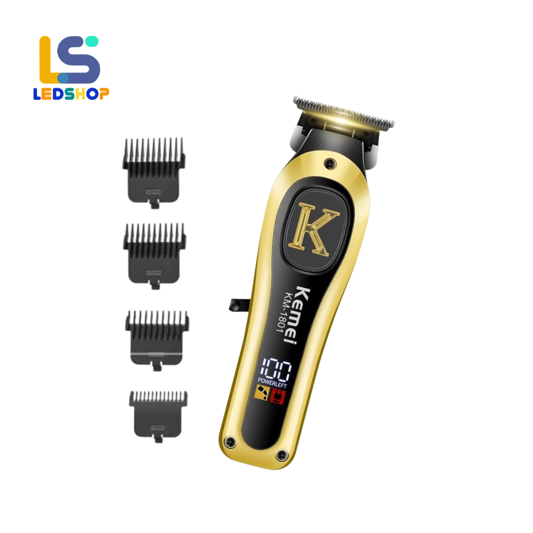 La recortadora Kemei KM-1801 es una máquina de corte de pelo y afeitadora profesional inalámbrica, diseñada para uso dual. Cuenta con una cuchilla en forma de T de acero al carbono, lo que permite cortes precisos, afeitados al cero y delineados nítidos.