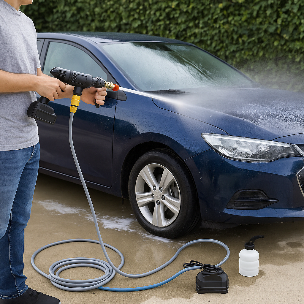 El producto de la imagen es una hidrolavadora portátil inalámbrica. Es una herramienta de limpieza que utiliza agua a alta presión para eliminar la suciedad de diversas superficies.