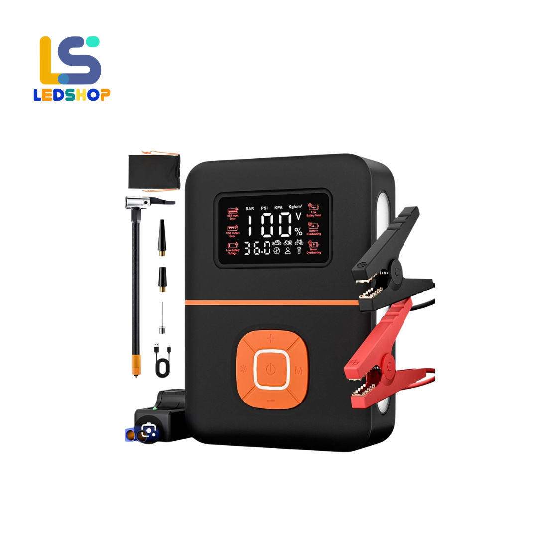 Compresor de aire: Equipado con un compresor de aire de 150 PSI y boquillas para inflar neumáticos de coche, bicicleta, motos y otros artículos inflables. Cuenta con apagado automático al alcanzar la presión establecida.