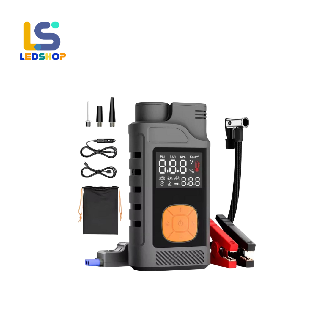 El arrancador multifunción que se muestra es un dispositivo 4 en 1 que funciona como arrancador de batería de emergencia, compresor de aire, linterna LED y cargador portátil USB.