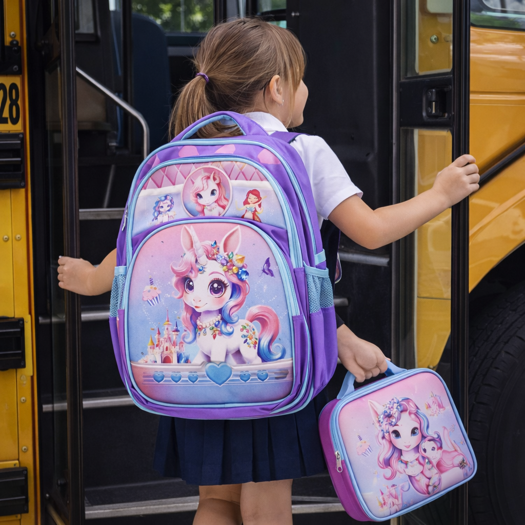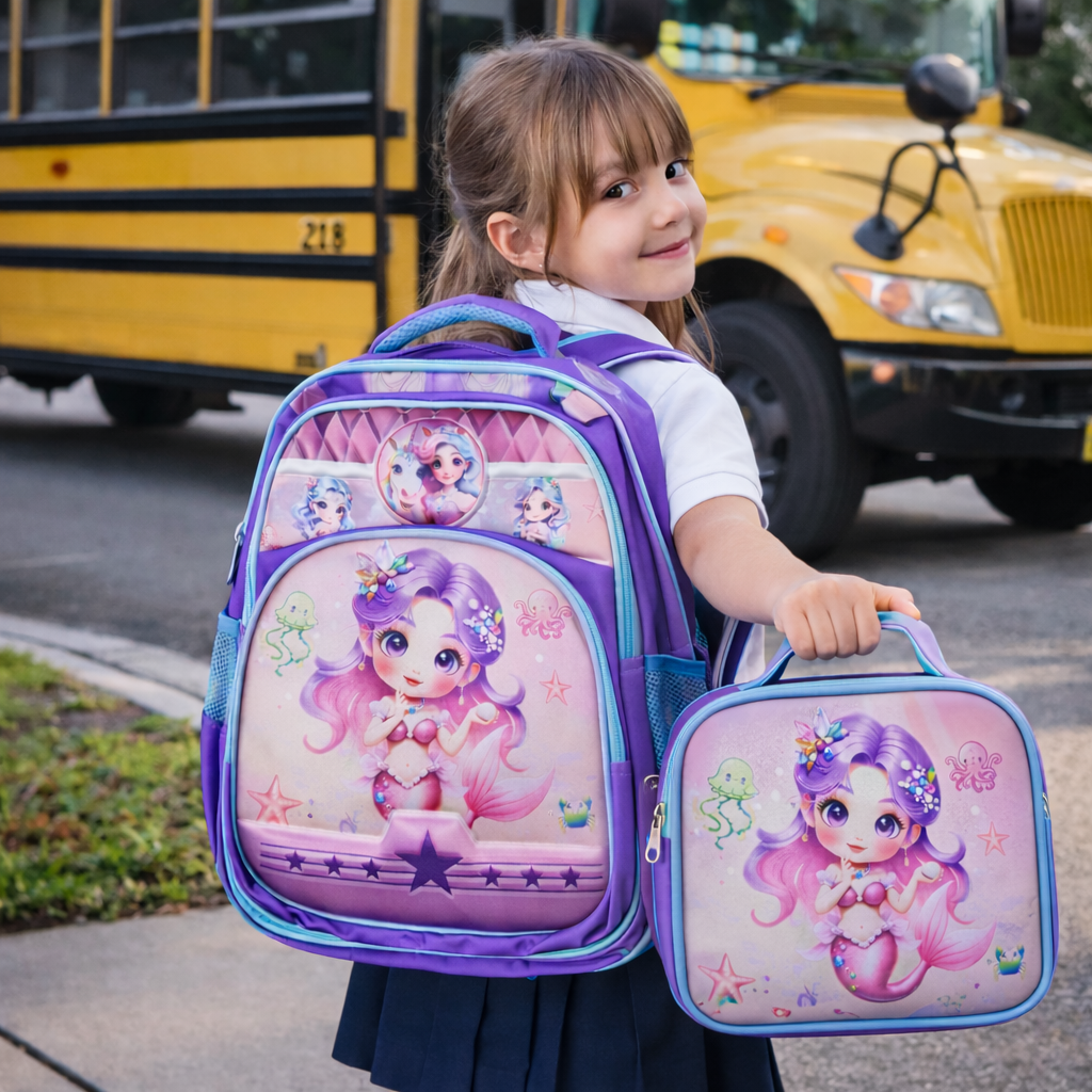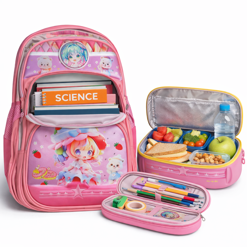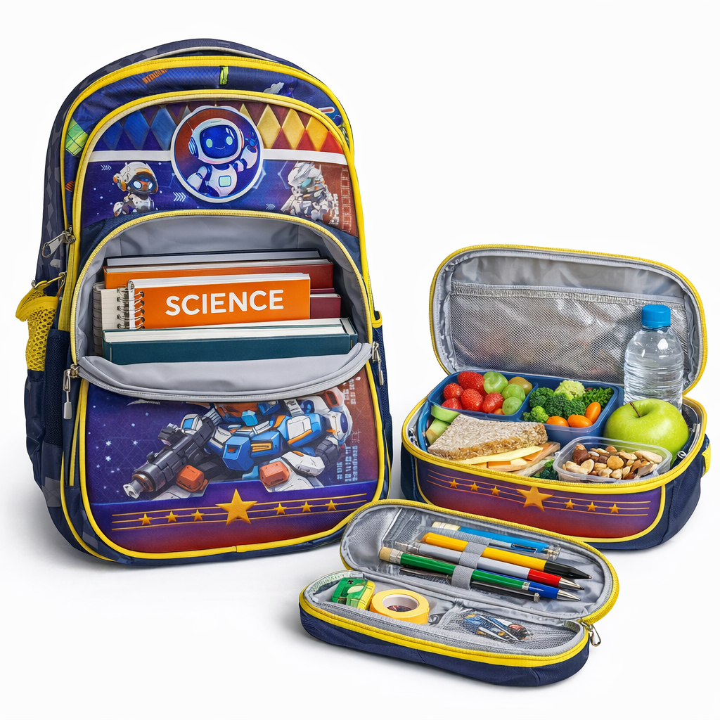El conjunto incluye una mochila, una lonchera y una cartuchera.